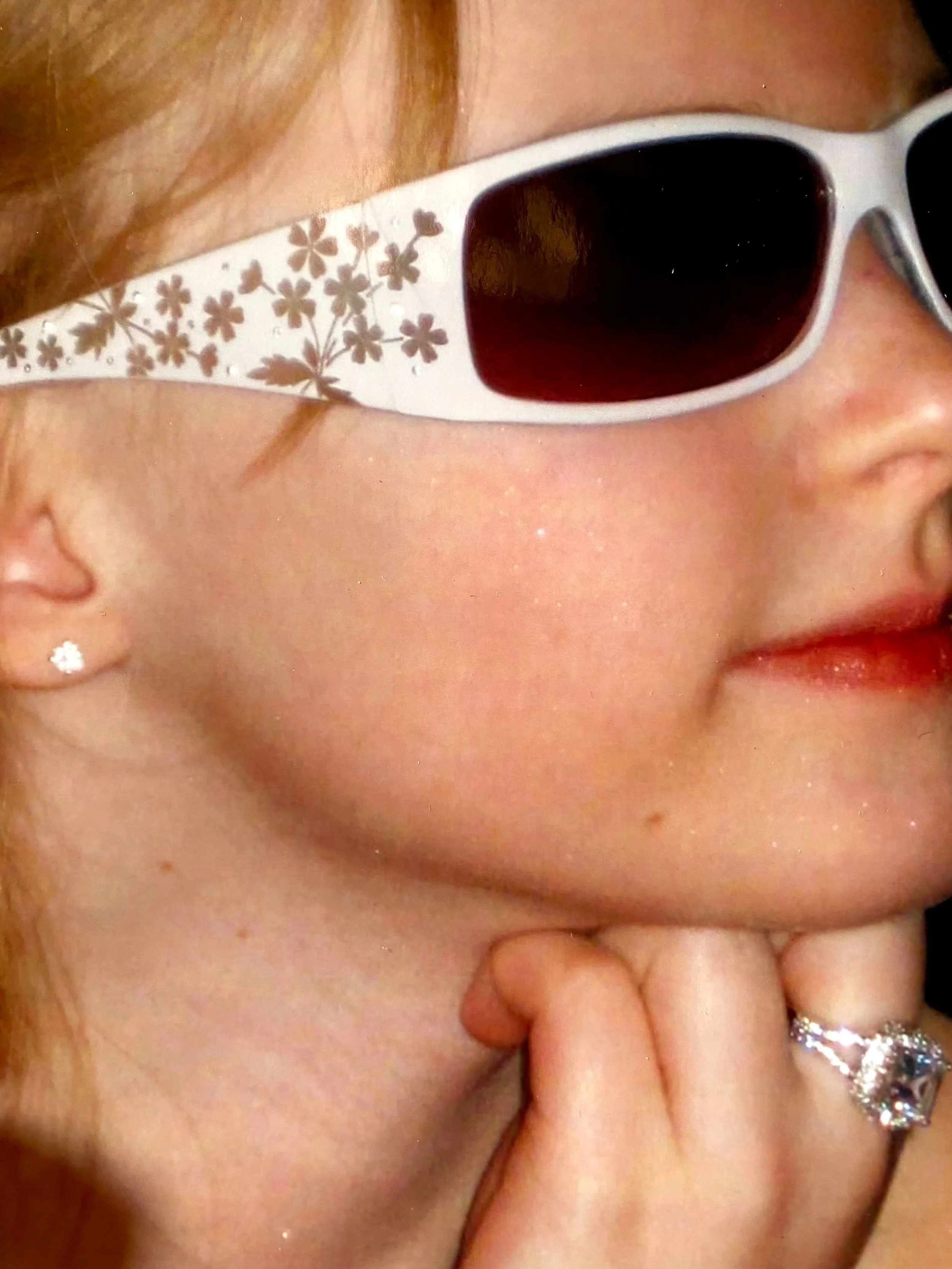 Lexi wearing sunglasses, pondering with a large faux diamond ring, 2007.